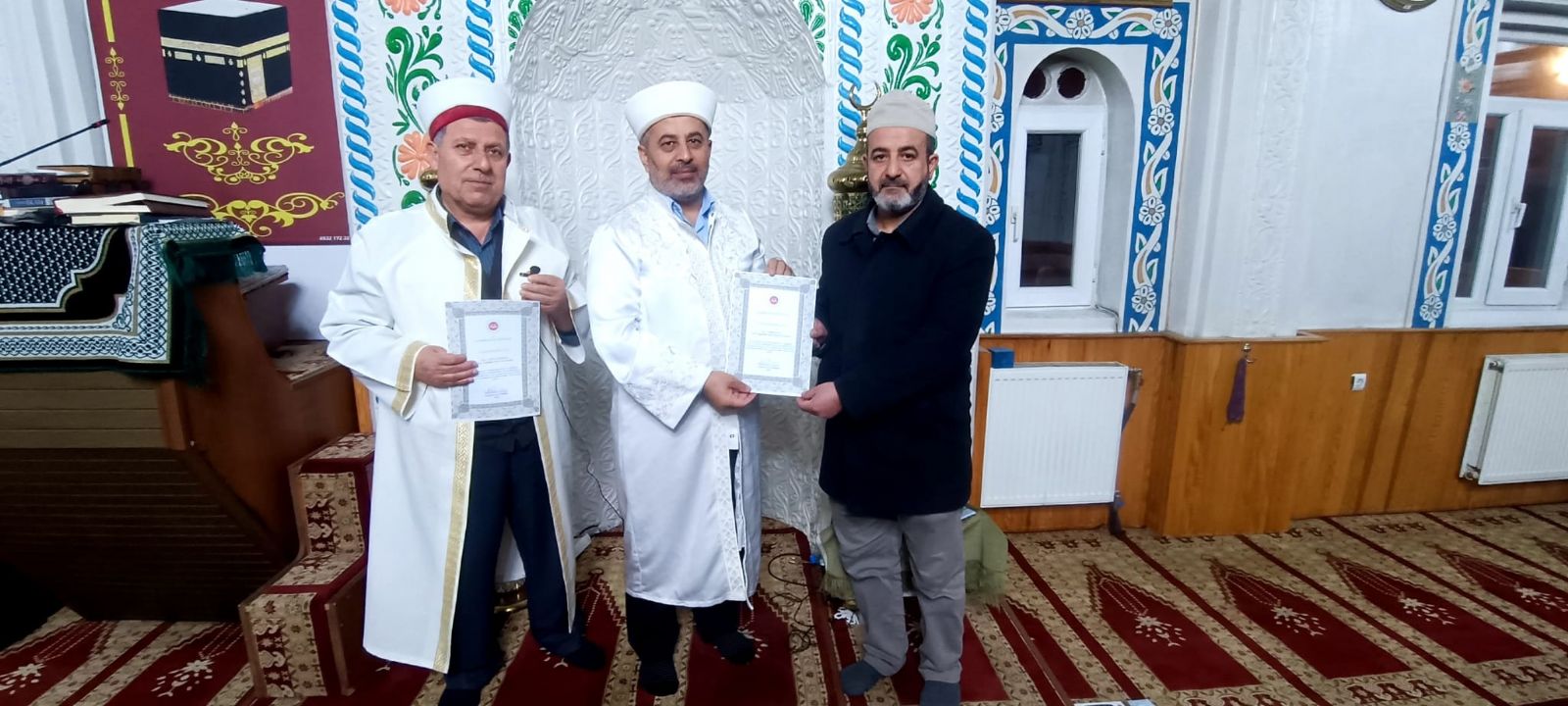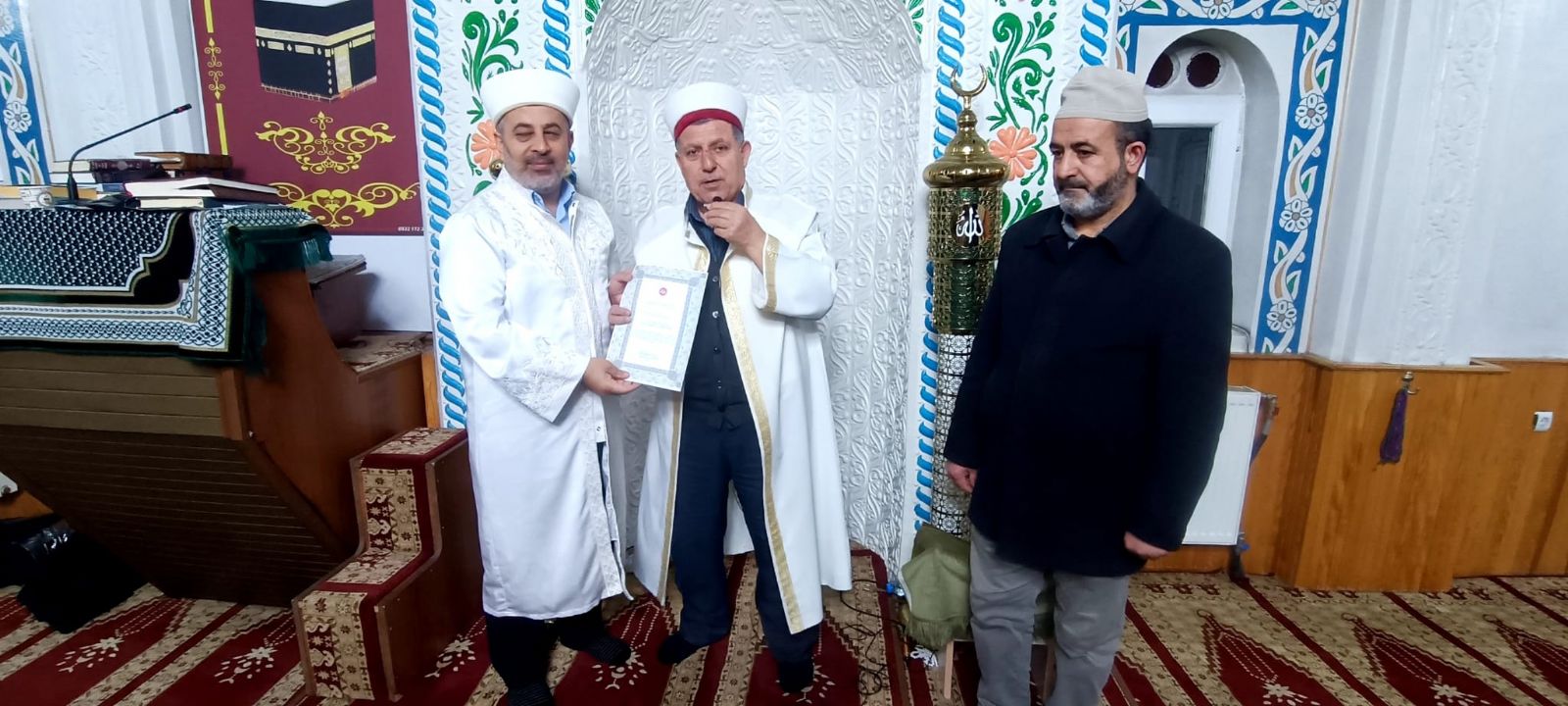Müftü Abdusselam Çakmak, kalıcı mimarı din görevlisi camii İmam Hatibi Halil Karabıyık, müezzin Mehmet Kılıç, ve ayrıca gönüllü olarak hizmet etmeyen Hayırseverlere teşekkür etti. Müftü Çakmak Teşekkür takdimi öncesinde yaptığı konuşmada, “Biz Müftülük olarak bu hizmet eden iyilik sadece Allah'tan bekleyen kardeşlerimize teşekkür ederim Bunlarla birlikte katılan İlçe müftülük personellerimizden Halil ve Mehmet hocalarıma da bu çabalarından dolayı kendilerine teşekkür belgesi vererek teşekkür etmek istedim çünkü bu belgeyi hakettiler”nda bulundu.